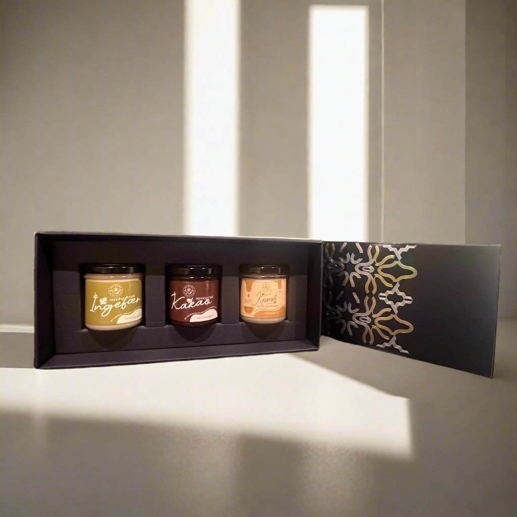 Skap en smakfull opplevelse med vår elegante gaveeske fylt med tre av dine favorittsmaker.