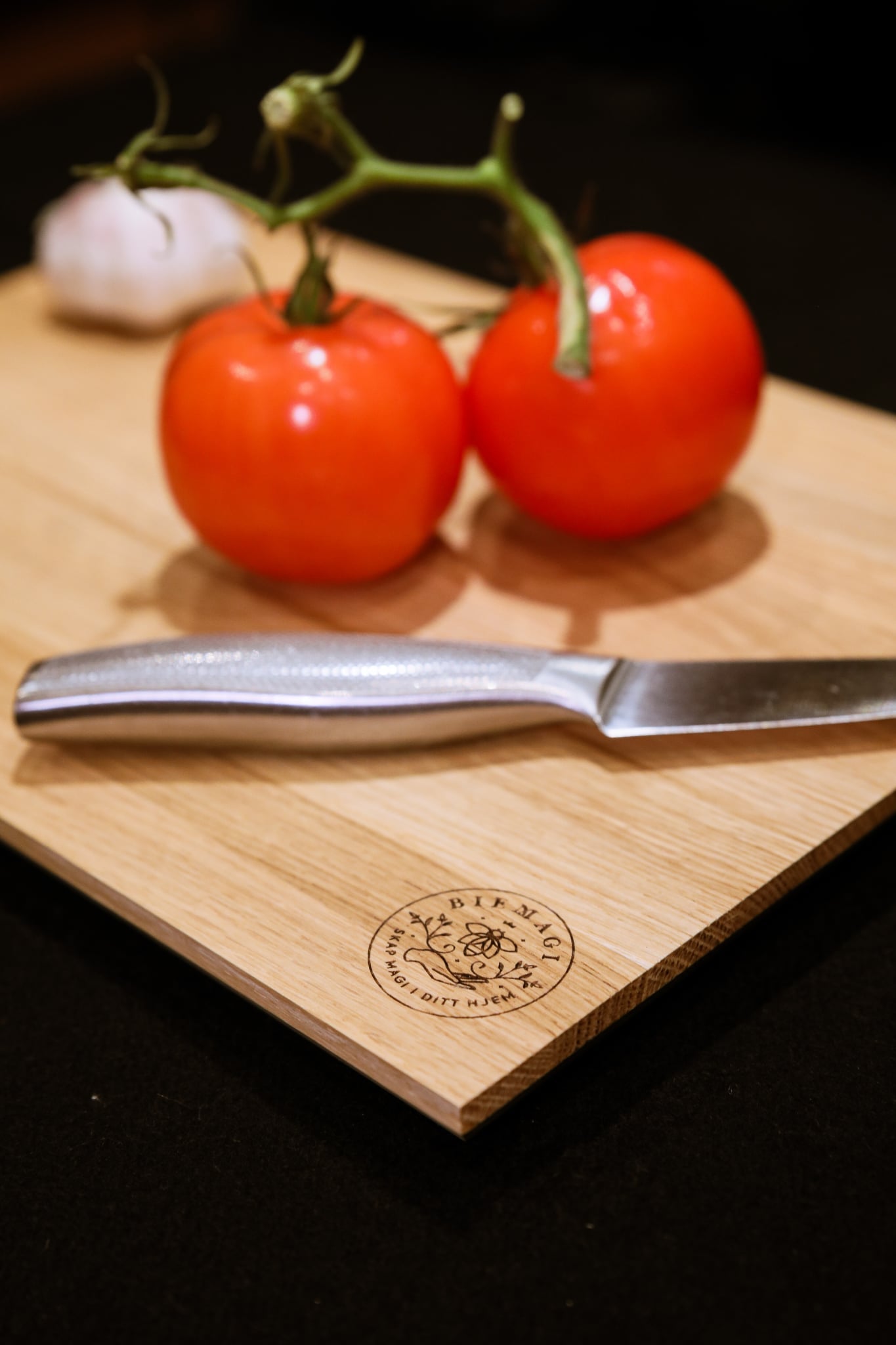 Håndlaget skjærebrett i eik, egnet både til skjæring og servering. Et solid og funksjonelt kjøkkenprodukt med naturlig uttrykk. Behandlet med matgodkjent olje og lim. Hvert brett er unikt.