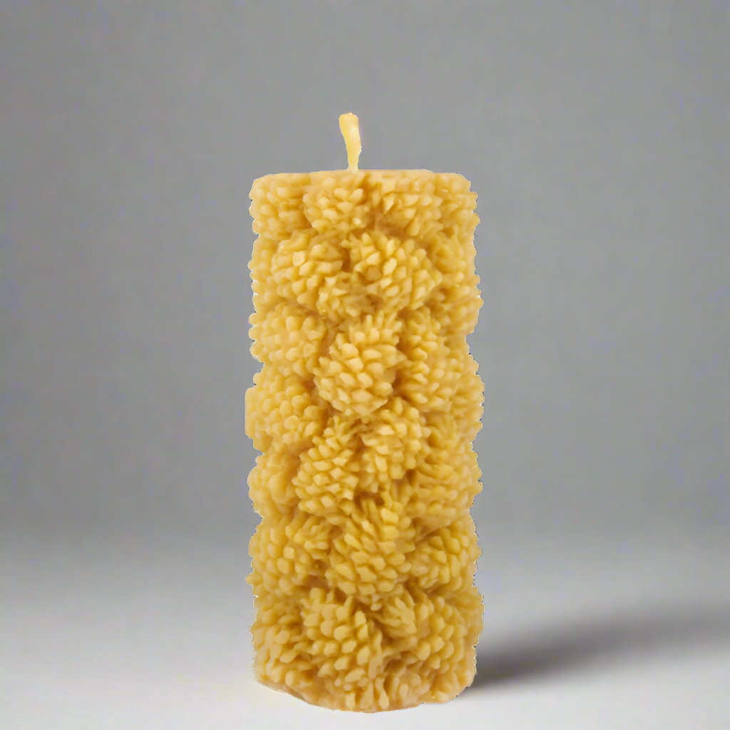 Bivokslyset "Stor Kongle" er et vakkert håndlaget lys med en struktur som etterligner formen og detaljene til en furukongle. Laget av 100 % naturlig bivoks, har det en dyp, gylden farge og avgir en behagelig, naturlig duft av honning når det brenner. Dette lyset er både dekorativt og funksjonelt, perfekt for å skape en varm og koselig atmosfære i hjemmet ditt, spesielt i høytidene.